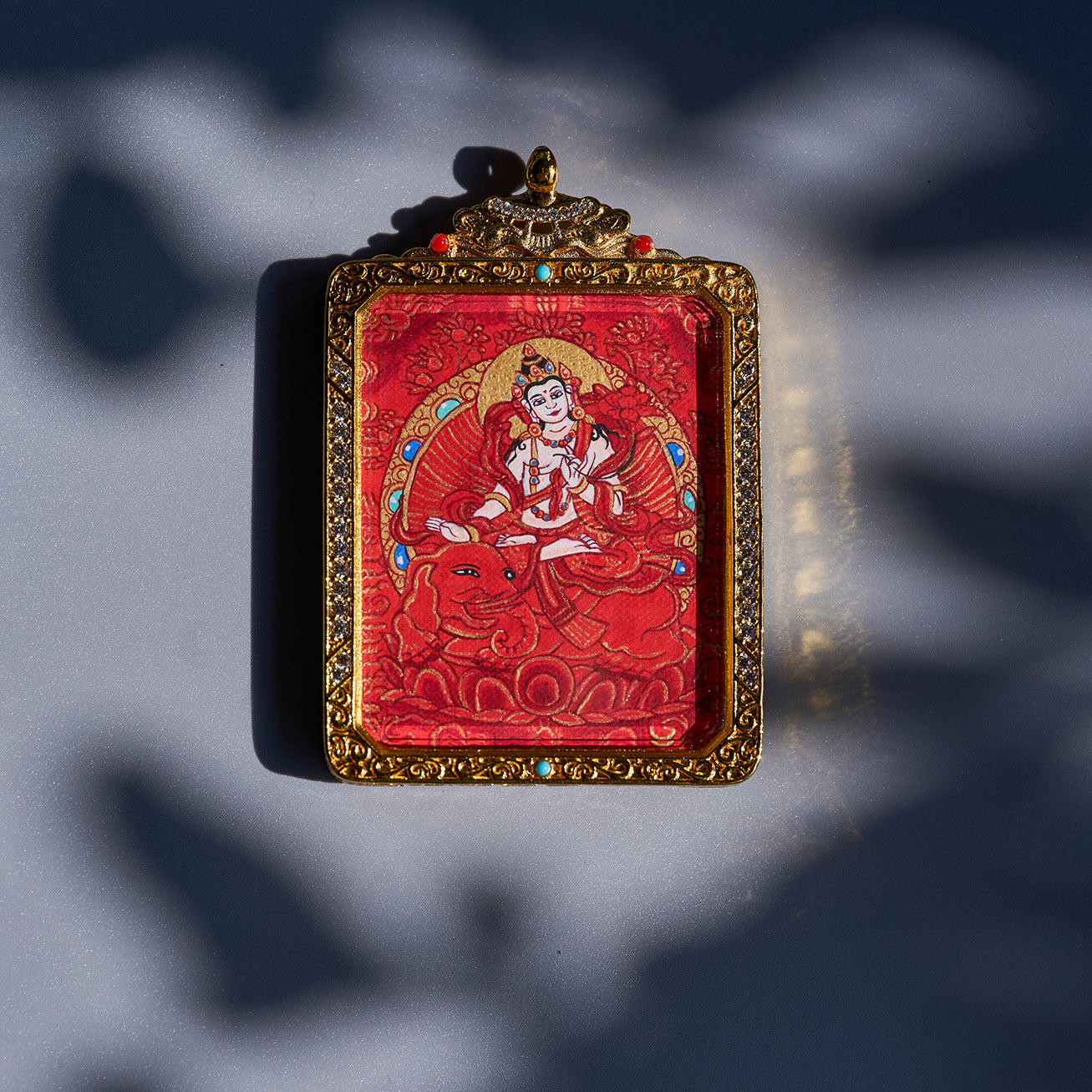 在唐卡上,黄金通常采用传统的贴金工艺:先涂上一层薄薄的粘合剂,然后放上金箔并轻轻打磨,最后用极细的画笔修饰边缘,使装饰、光环和神圣的细节更加突出。